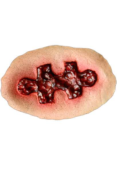 Fyra latexapplikationer: Setet innehåller fyra olika latexapplikationer som efterliknar de skrämmande pusselbitarna som Jigsaws offer bär.