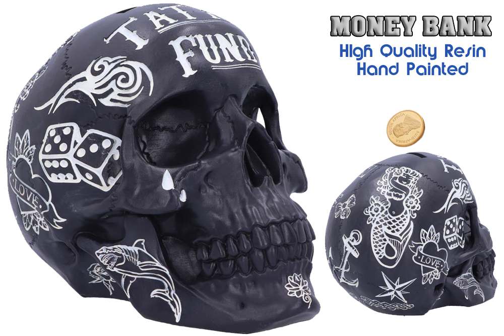 Den svarta tatuering skalle pengabanken är en unik och stilren inredningsdetalj som både är funktionell och dekorativ. Med en höjd på över 22 cm är denna pengabank gjord av högkvalitativ resin och är noggrant handmålad för att ge en fantastisk finish. Denna pengabank är perfekt för den som älskar alternativ stil eller tatueringar och vill ha något särskilt i sitt hem.
