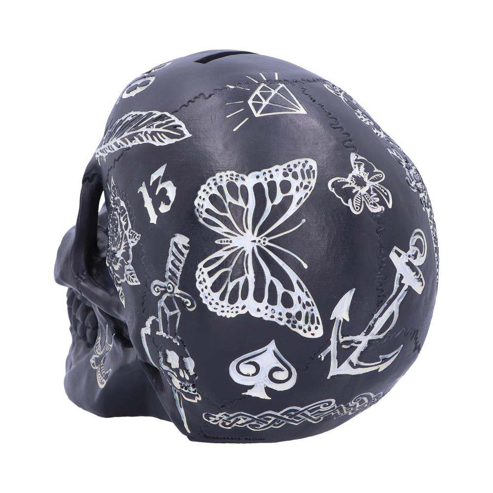 Ge din inredning ett unikt uttryck med vår svarta tatuering skalle pengabank. Den är inte bara en praktisk lösning för att spara pengar utan också en fantastisk konversationsstartare. Oavsett om du använder den hemma eller på kontoret, kommer den att dra till sig uppmärksamhet och beundran.